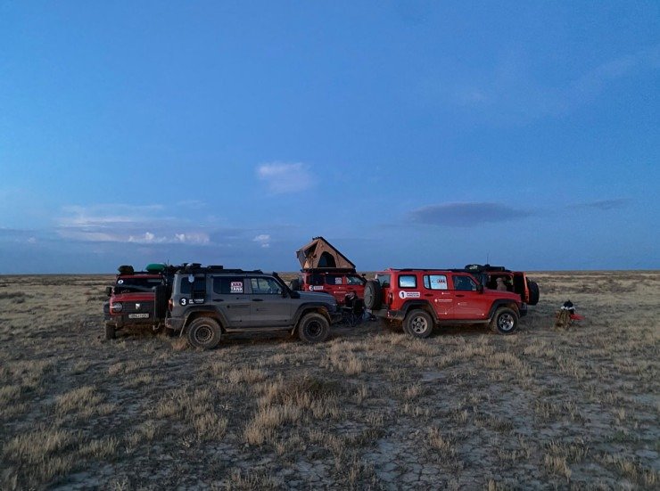 Поездка по пустыне Оралкум заняла почти десять часов. В течение всего пути с нашими TANK не возникало абсолютно никаких проблем, но по дороге мы помогли нескольким людям. Один из них - водитель внедорожника Toyota - проколол колесо, попытался спасти его жгутом, но и это не помогло. Домкрата у него не было, а авто, которое остановилось ему помочь, тоже застряло - сел аккумулятор. В итоге наша дружная команда всех спасла, и мы двинули дальше.
